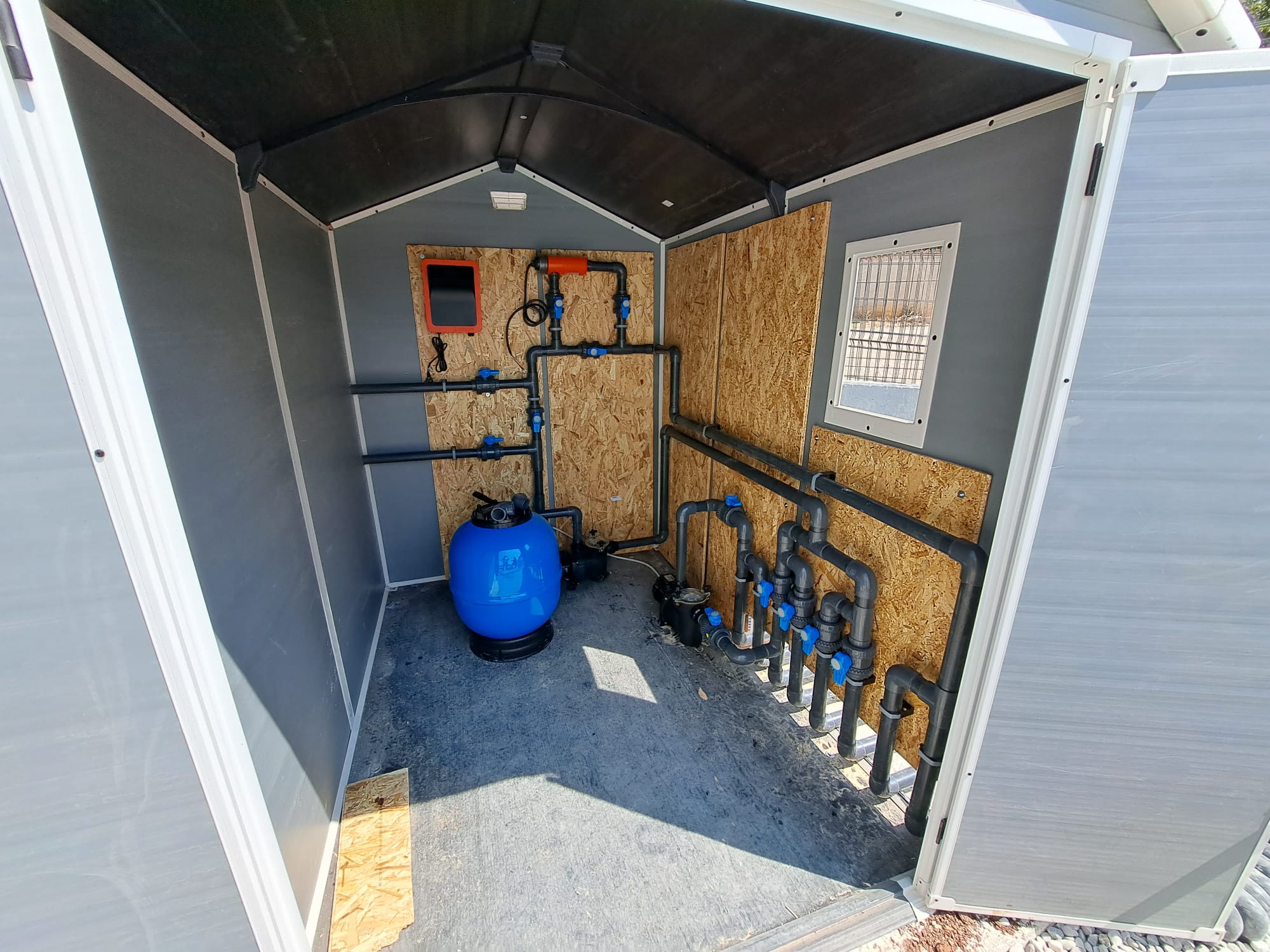 Cijeli sustav postavljen je na čvrstoj plastičnoj osnovi. Filter ima gornji poklopac velikog promjera kako bi izmjena pijeska bila što jednostavnija.